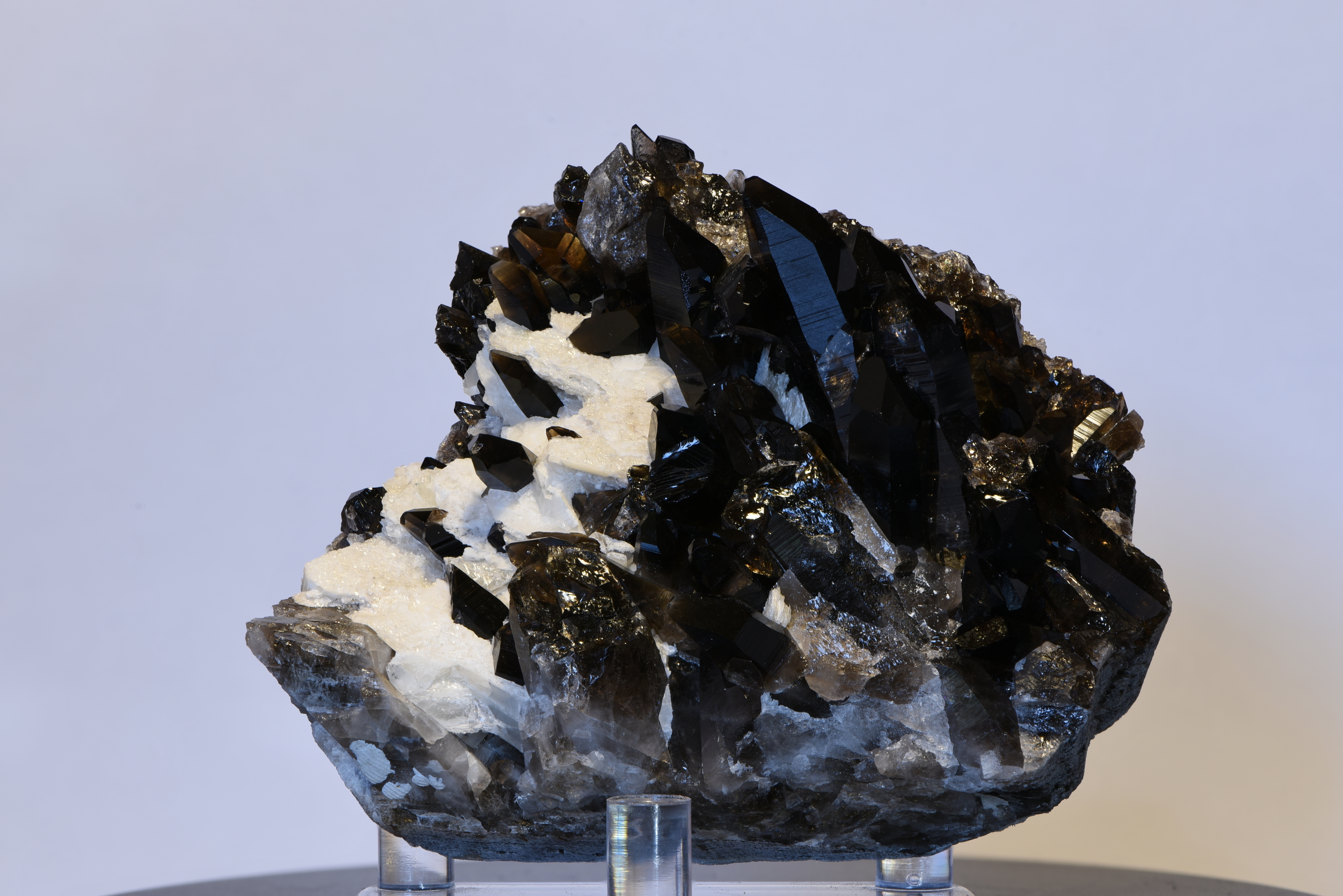 Diese Stufe besticht mit einer sehr dunklen Farbe, sodass die Rauchquarze schon fast als "Morione" (tiefschwarze Rauchquarze) bezeichnet werden können. Außerdem ist der Farbunterschied zwischen den schwarzen Kristallen und dem weißen Calzit einzigartig. Der Stein wurde beim Scharrn im Hollersbachtal gefunden.