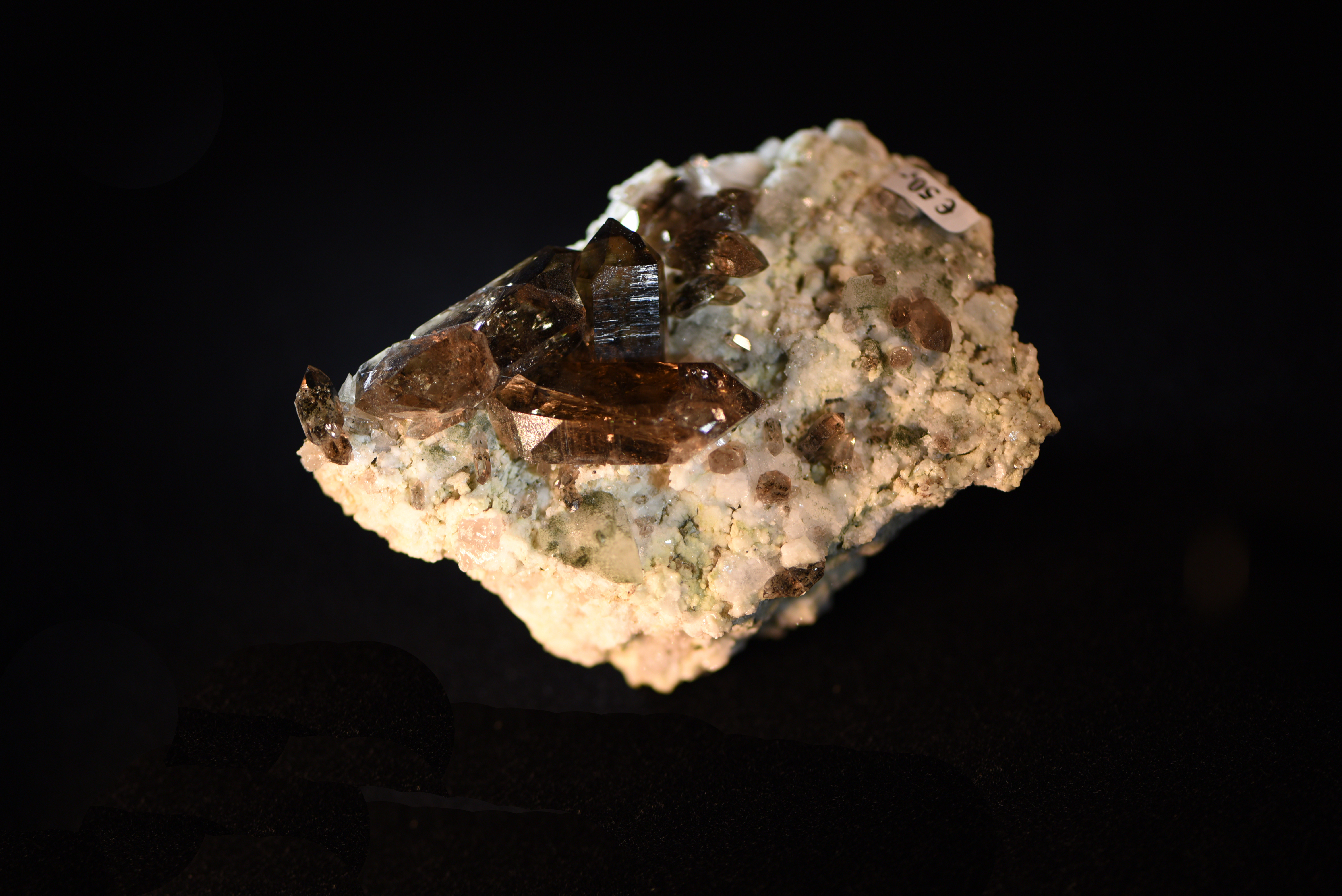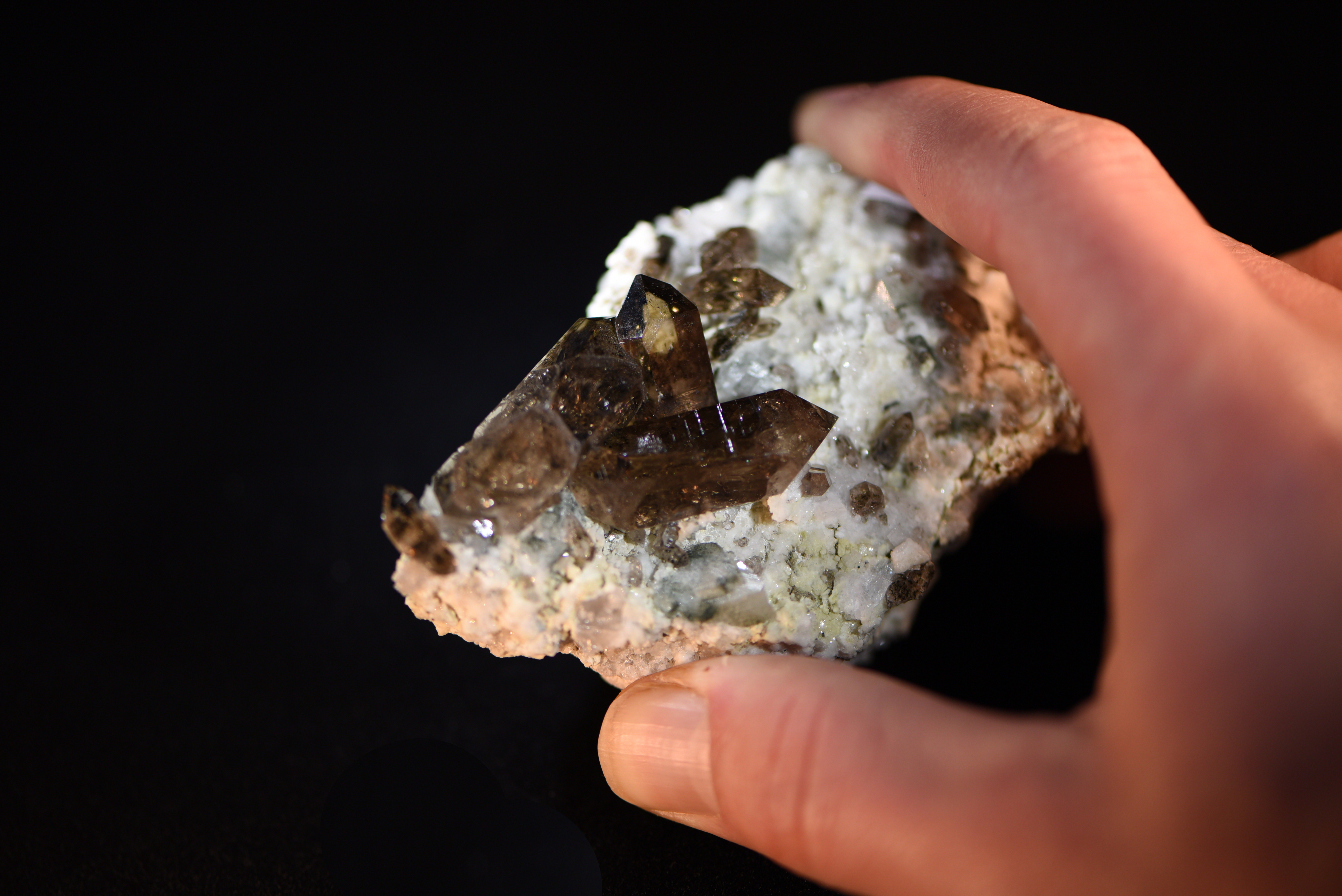 3 Doppelender und ein "normaler" Rauchquarz sitzen auf der hellen - mit Adular besetzten - Stufe. Dadurch entsteht ein toller Kontrast zwischen dem weißen Untergrund und den rauchigen Kristallen.