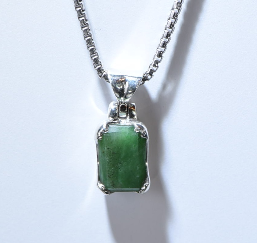 Der Ugrandit ist ein grüner Granat, der im Zillertal gefunden wird und eine hellgrüne Farbe hat. Der Stein misst 11 mm x 7 mm und wurde facettiert und in einen Silberanhänger eingefasst.