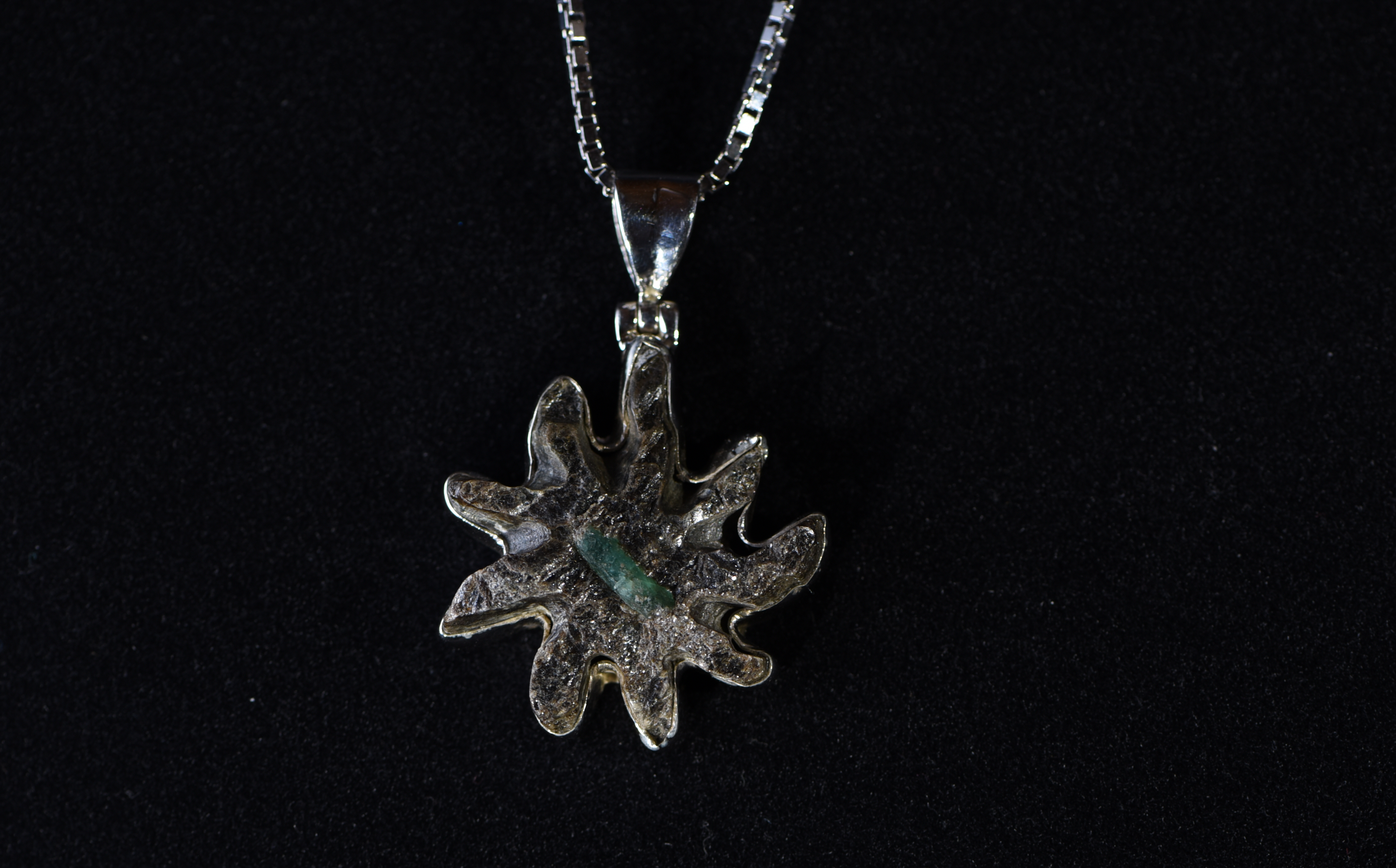 Der Smaragd sitzt mittig im edelweißförmigen Talk-Schiefer-Gestein. Die Kristallgröße beträgt 1 cm. Der Smaragd wurde im Smaragdbergbau im Habachtal (Bramberg, Salzburg, Österreich) gefunden und in Silber eingefasst (Randfassung mit einer hinten geschlossenen Silberplatte).