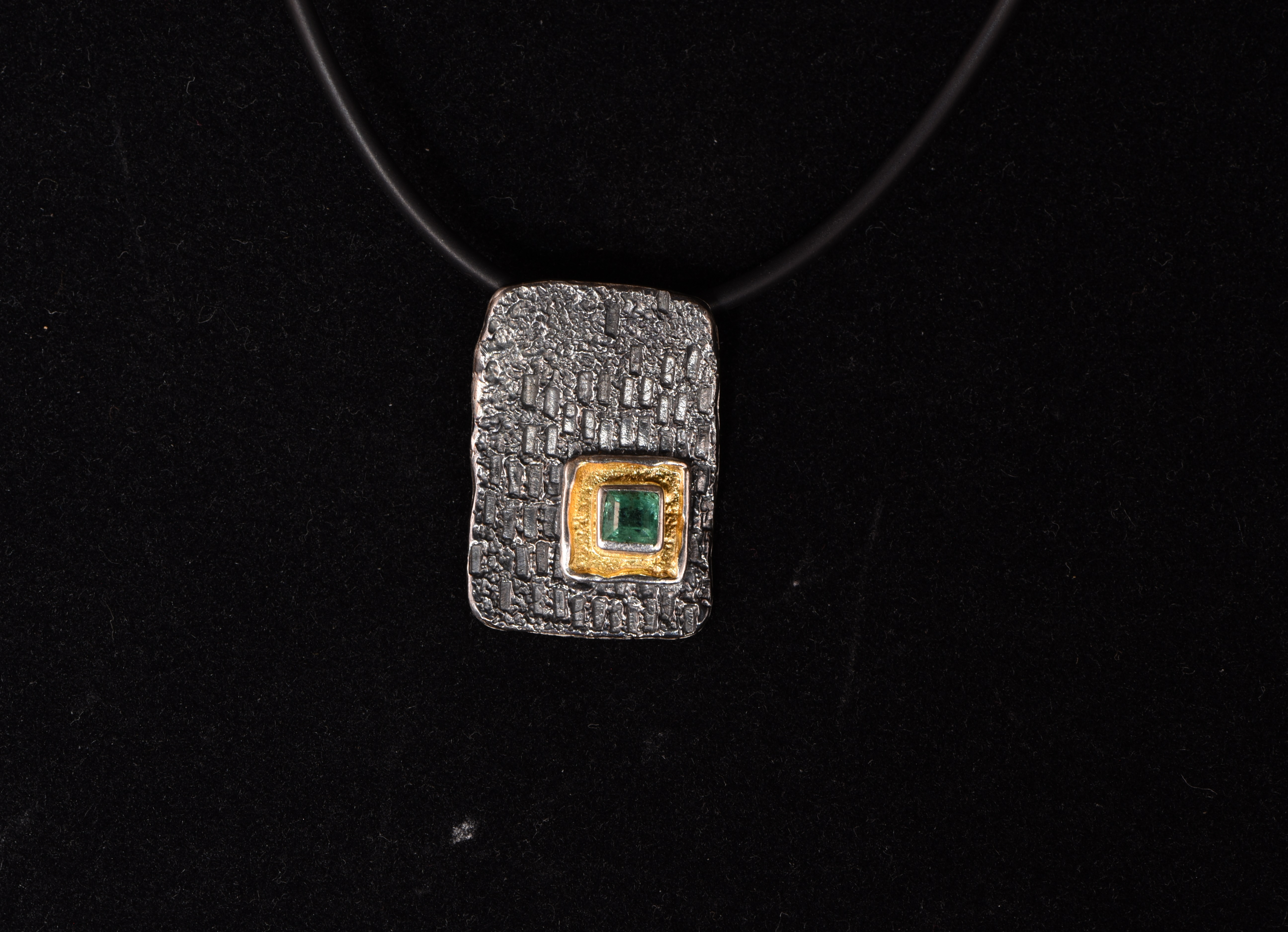 Ein wunderschöner, 4 mm x 4 mm großer, facettierter Habachtal-Smaragd wurde in einen Silberanhänger eingearbeitet. Die Oberfläche der Silberplatte ist gehämmert, teilweise geschwärzt und teilweise vergoldet und gibt dem Anhänger einen einzigartigen Look. Der Stein wurde beim Smaragdbergbau im Habachtal (Bramberg, Salzburg, Österreich) gefunden.