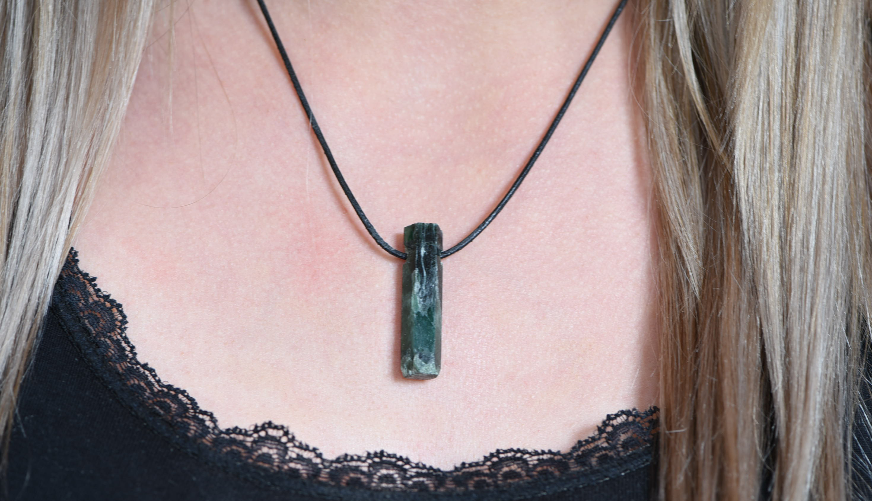 Ein 3,6 cm x 0,9 cm großer Smaragd wurde an den Naturflächen nachgeschliffen. Der Stein wurde bei der Smaragdmine im Habachtal in Bramberg (Salzburg, Österreich) gefunden. Der Anhänger ist an einem größenverstellbarem Lederband befestigt.
