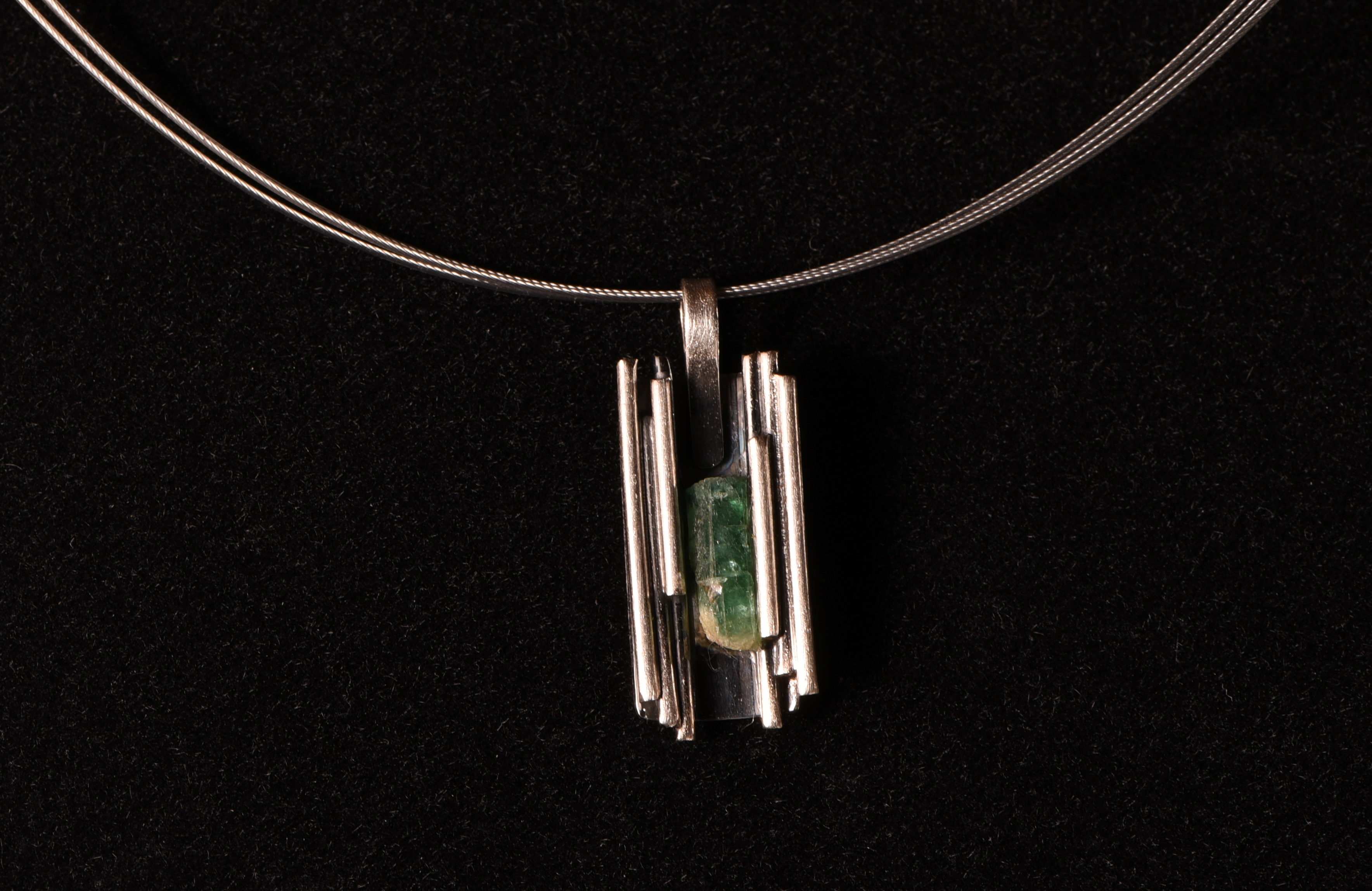 Ein 1 cm langer, naturbelassener Smaragd, der durch seine gute Farbe hervorsticht, ist in Silber eingefasst. Das Silber ist teilweise geschwärzt. Der Stein wurde im Smaragdbergbau im Habachtal (Bramberg, Salzburg, Österreich) gefunden. Die Halskette besteht aus 3 Stahlseilen und ist im Preis enthalten.