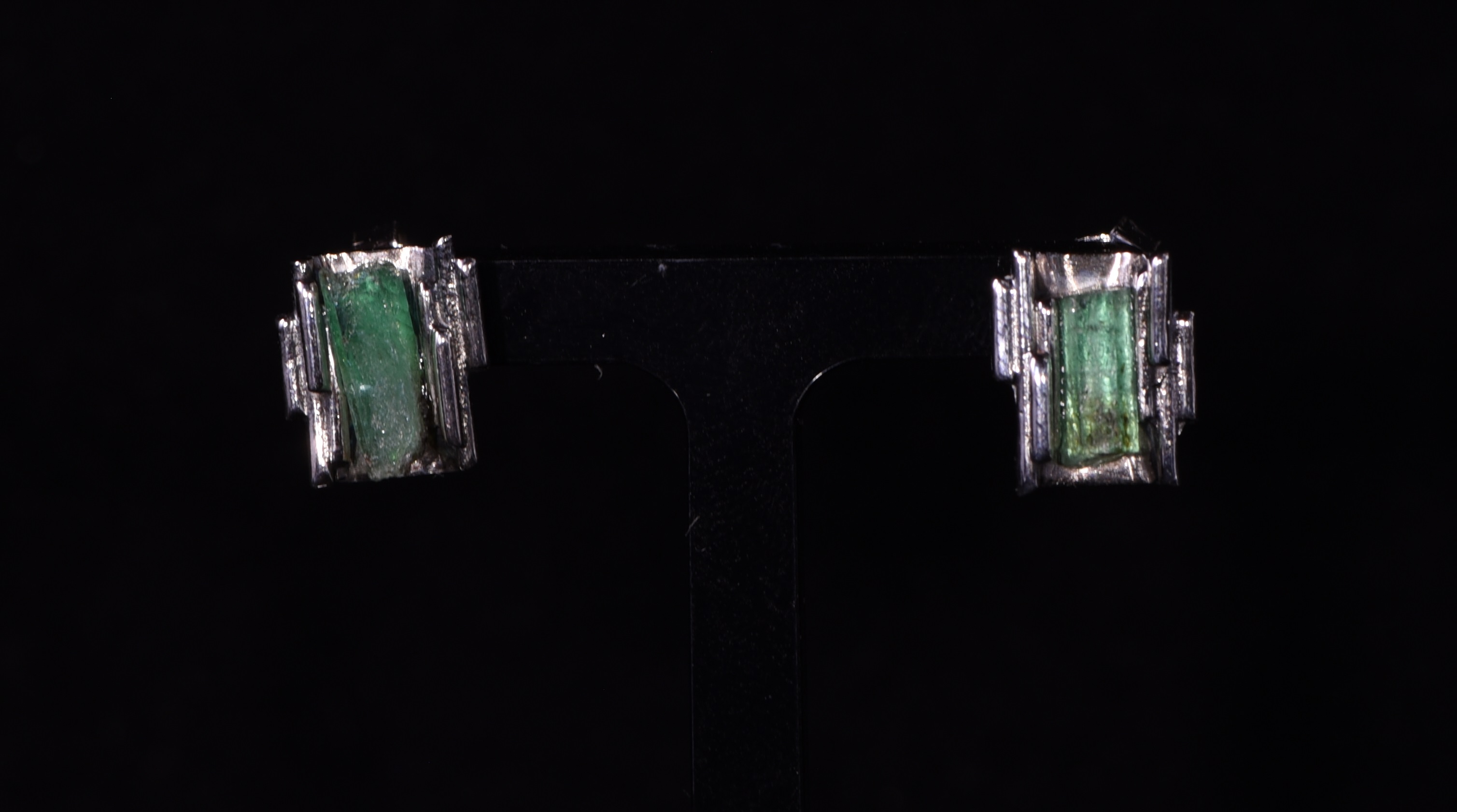 Die beiden Smaragde haben eine sehr gute Qualität, sind naturbelassen und in Silber eingefasst. Die Kristalle sind jeweils 0,8 cm lang und das Metall ist teilweise geschwärzt. Die Steine wurden im Smaragdbergbau im Habachtal (Bramberg, Salzburg, Österreich) gefunden.