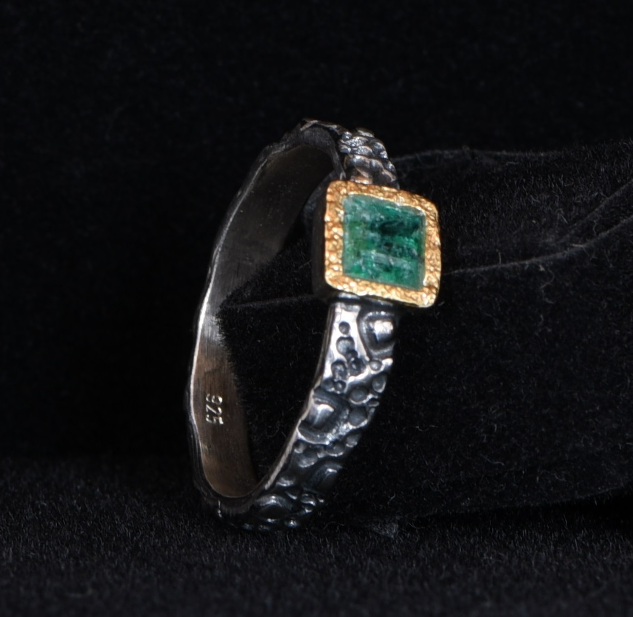 Ein 5 mm x 5 mm großer, facettierter Smaragd mit Top-Qualität wurde in einen Silberring eingefasst. Der Silberring ist teilweise vergoldet und geschwärzt. Der Smaragd wurde im Smaragdbergbau im Habachtal (Bramberg, Salzburg, Österreich) gefunden.