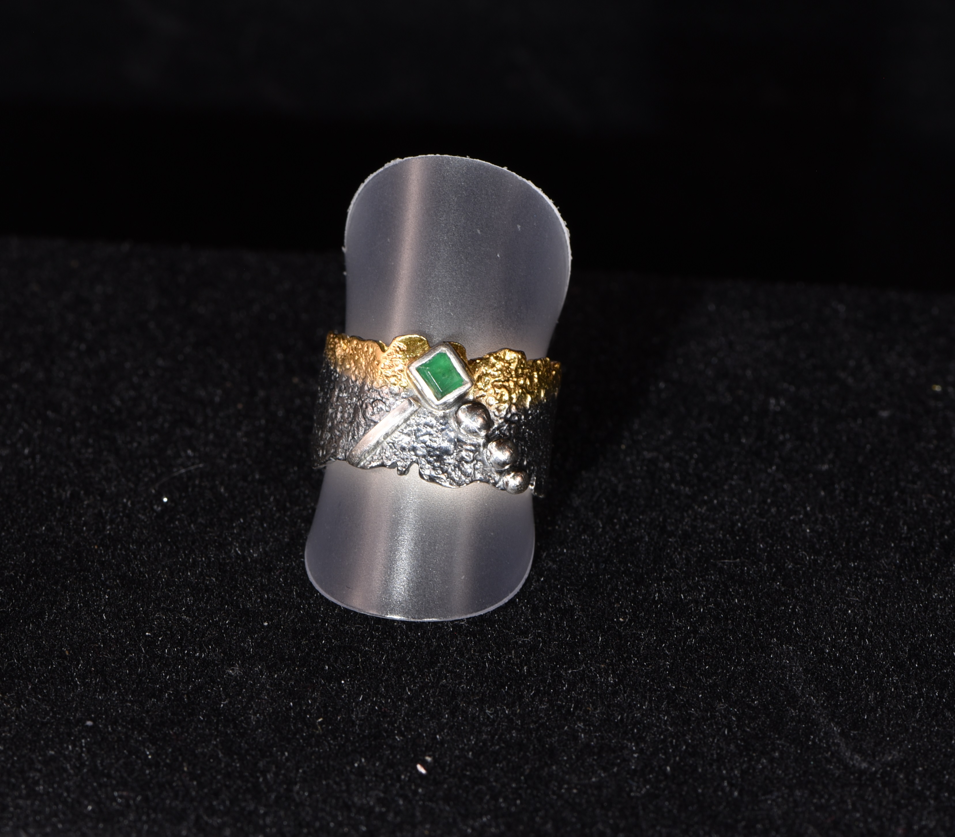 Ein 3 mm x 3,5 mm großer, facettierter Smaragd mit Top-Qualität wurde in einen Silberring eingefasst. Der Silberring ist teilweise vergoldet und geschwärzt. Der Smaragd wurde im Smaragdbergbau im Habachtal (Bramberg, Salzburg, Österreich) gefunden.