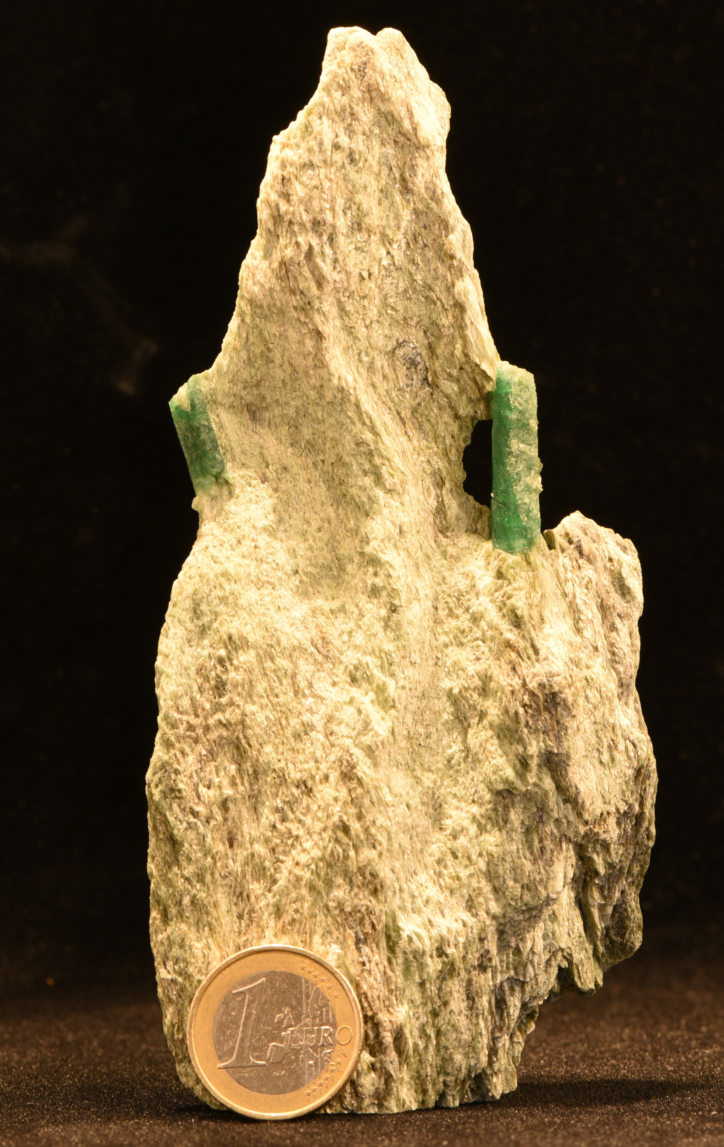 Auf dieser kunstvoll ausgearbeiteten Stufe sitzen 2 Smaragde - der kleinere Smaragd misst bereits 1,4 cm und hat eine gute Farbe, der größere misst stolze 2,7 cm und hat eine unglaublich gute Farbe und weist sogar etwas Transparenz auf, was den Stein richtig leuchten lässt. Es ist sehr selten, dass das Muttergestein eines Habachtal-Smaragdes so stabil ist, dass der Smaragd auf diese Art und Weise ausgearbeitet werden kann. Die Stufe hat einen sehr guten Stand und lässt sich von beiden Seiten betrachten
