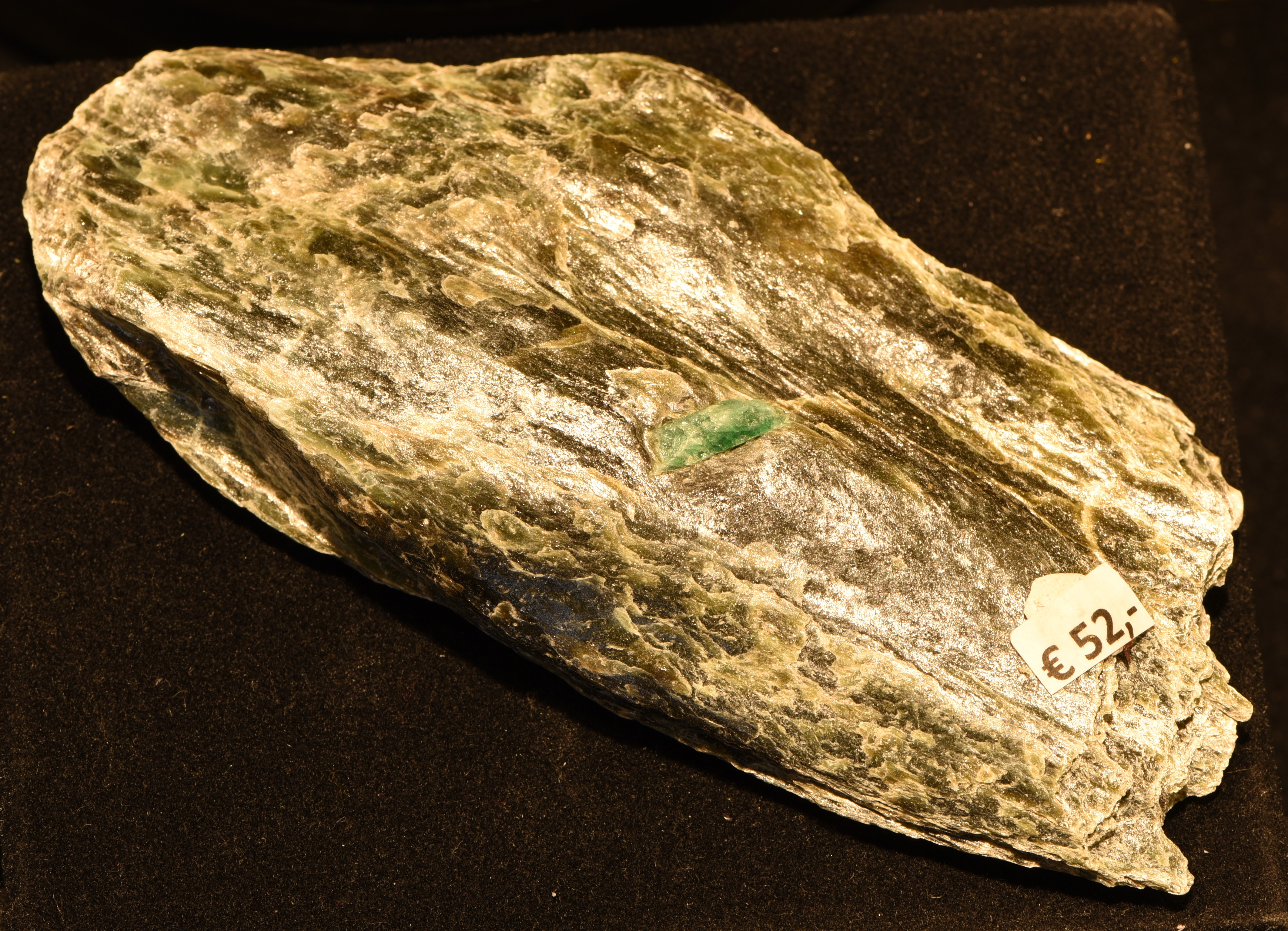 Auf dieser kleinen Stufe sitzt ein 1,3 mm langer Smaragd mit einer schönen, hellgrünen Farbe. Die Oberfläche vom Kristall ist leider angebrochen, dennoch hat der Stein eine sehr gute Farbe und das umliegende Biotit-Glimmerschiefergestein glänzt wie Silber.