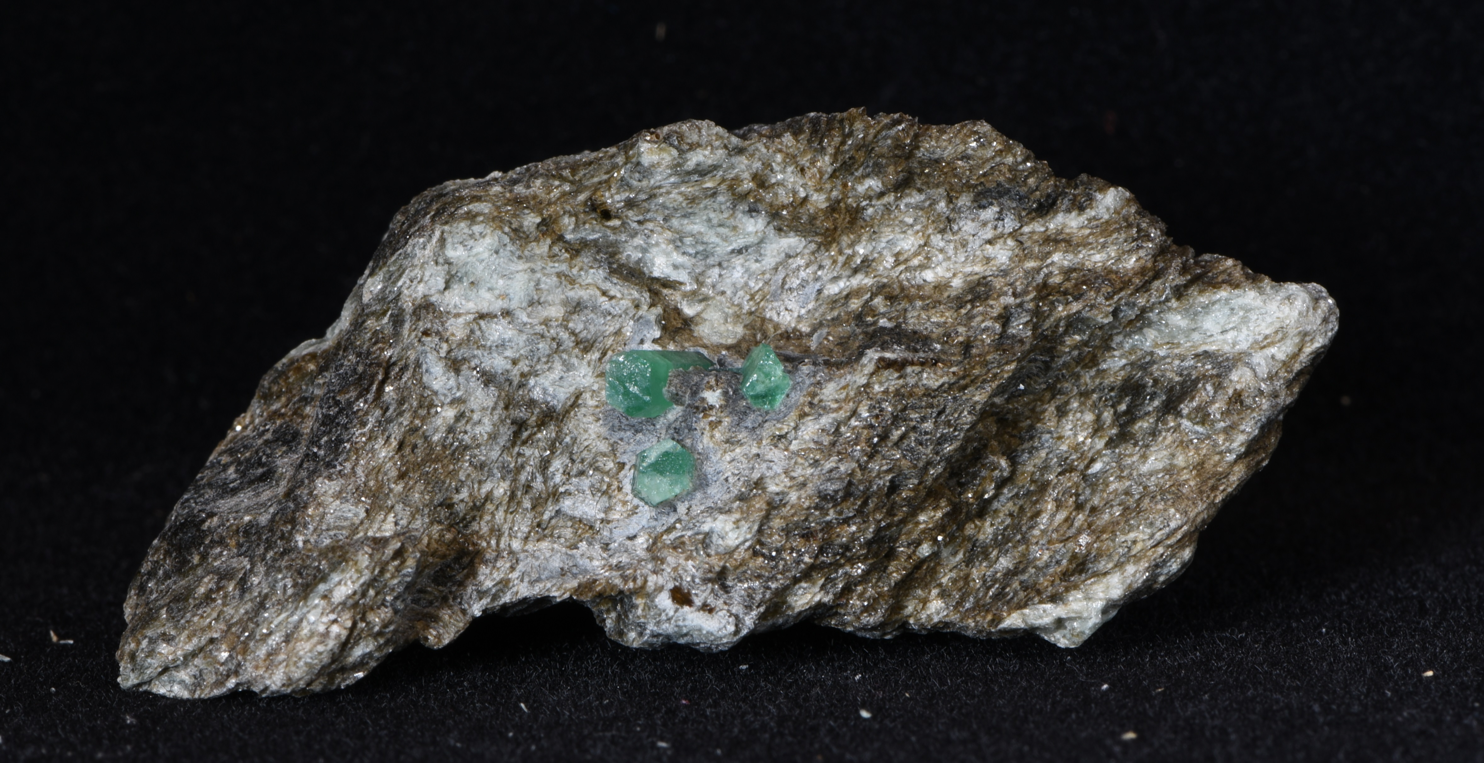 Auf dieser kleinen Stufe sitzt eine Gruppe aus 3 Smaragden mit guter Qualität. Der längste davon ist 6 mm lang.