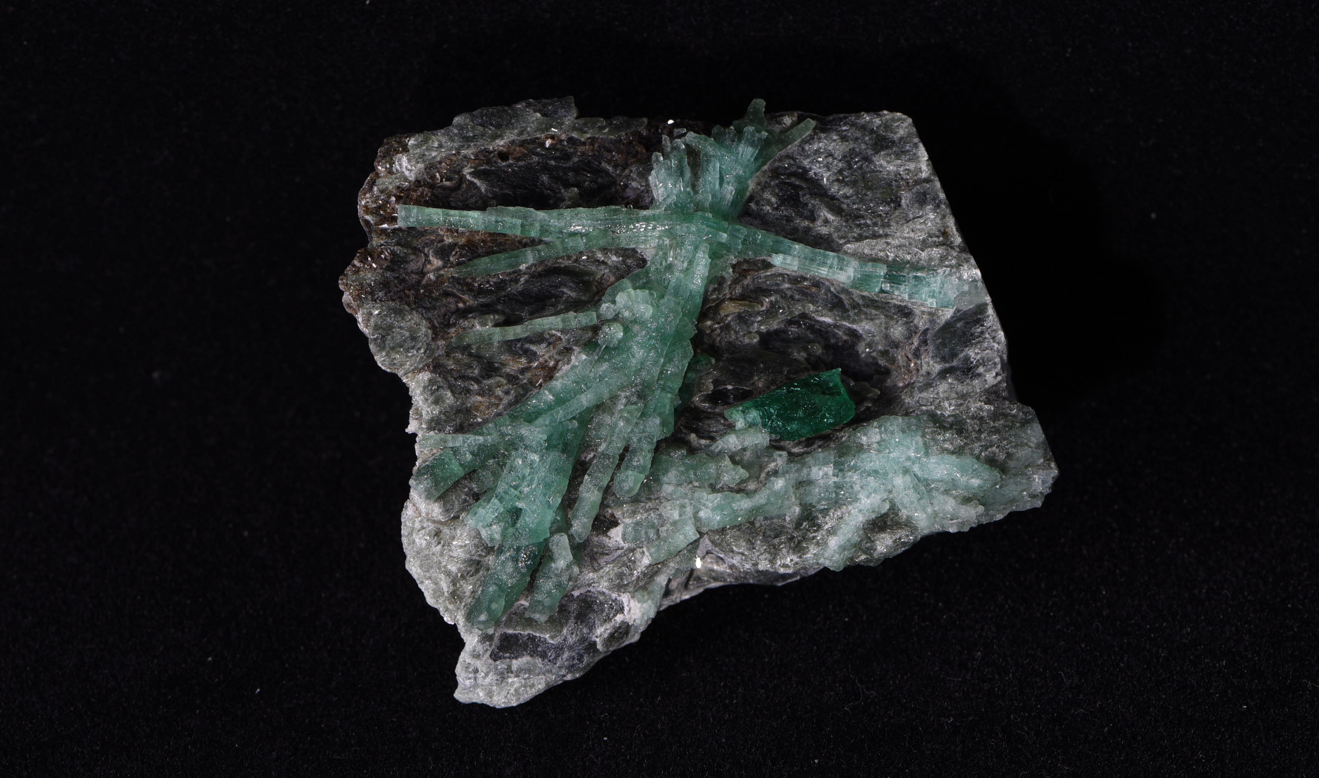 Eine ganz besondere Stufe! 2 Smaragdadern sind in ein Smaragdkreuz verwachsen. Die längere "Smaragdader" ist 5 cm lang, die kürzere 4,5 cm. Unter dem Kreuz befindet sich noch ein einzelner Smaragd mit Top-Qualität und Farbe.