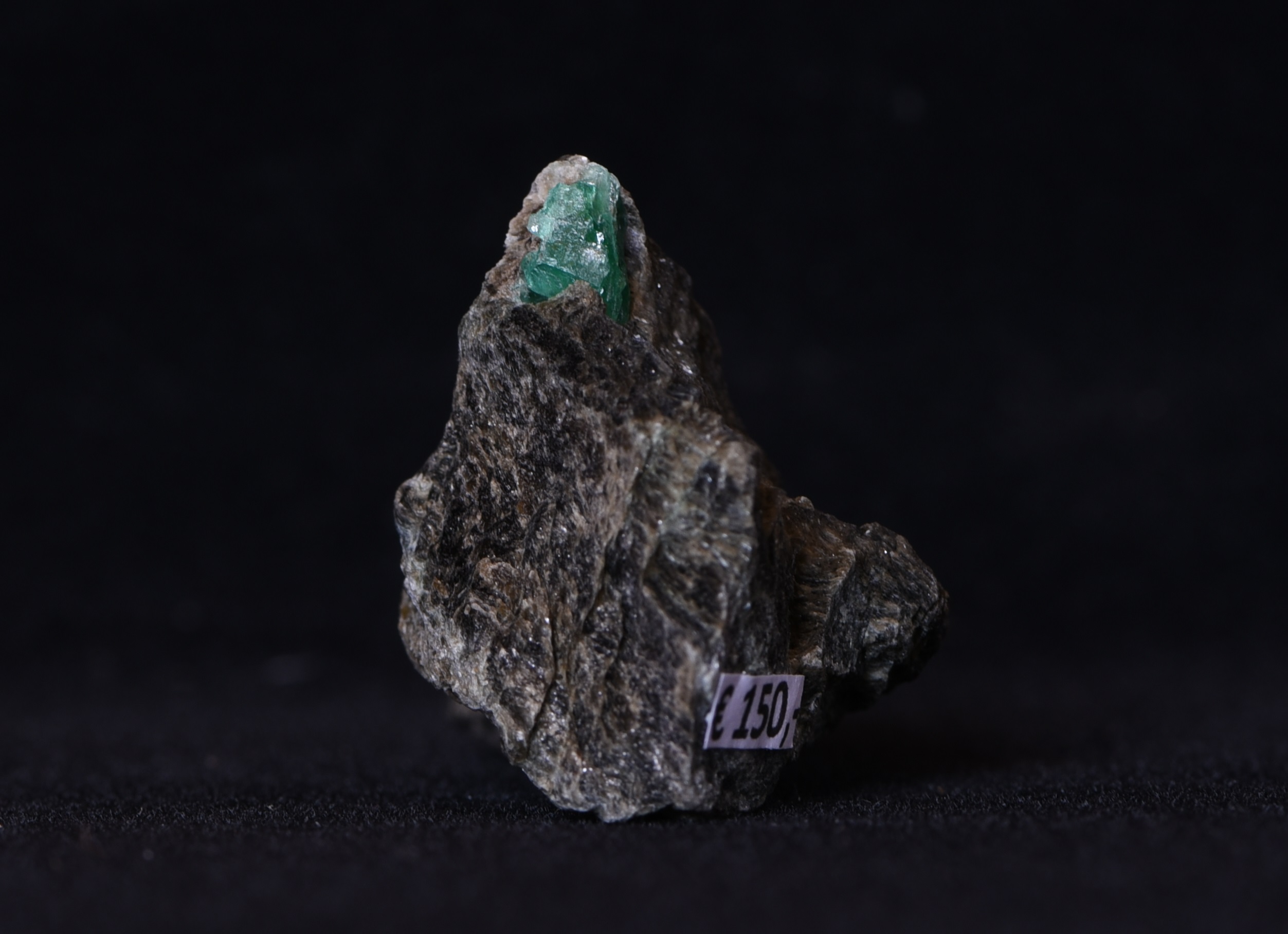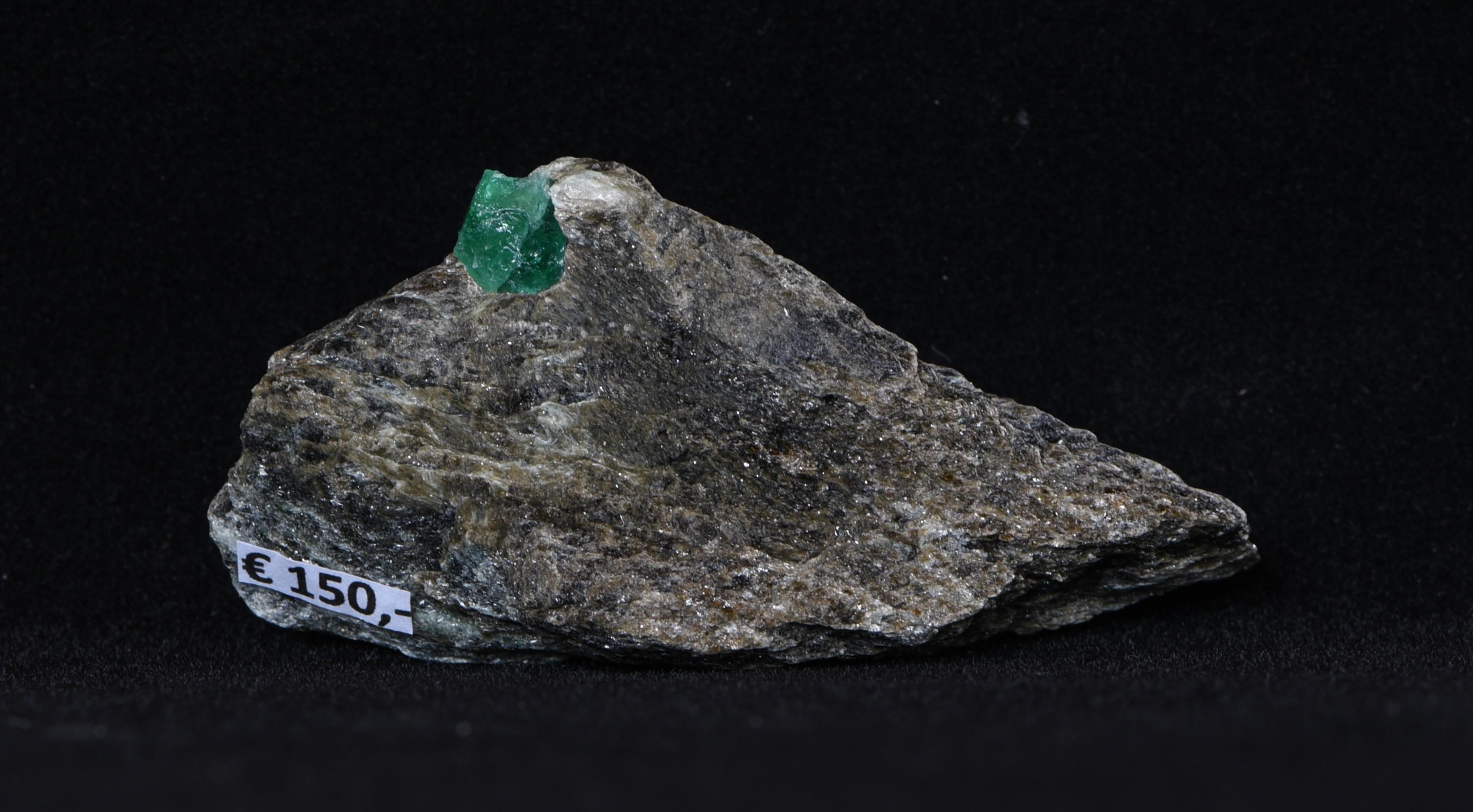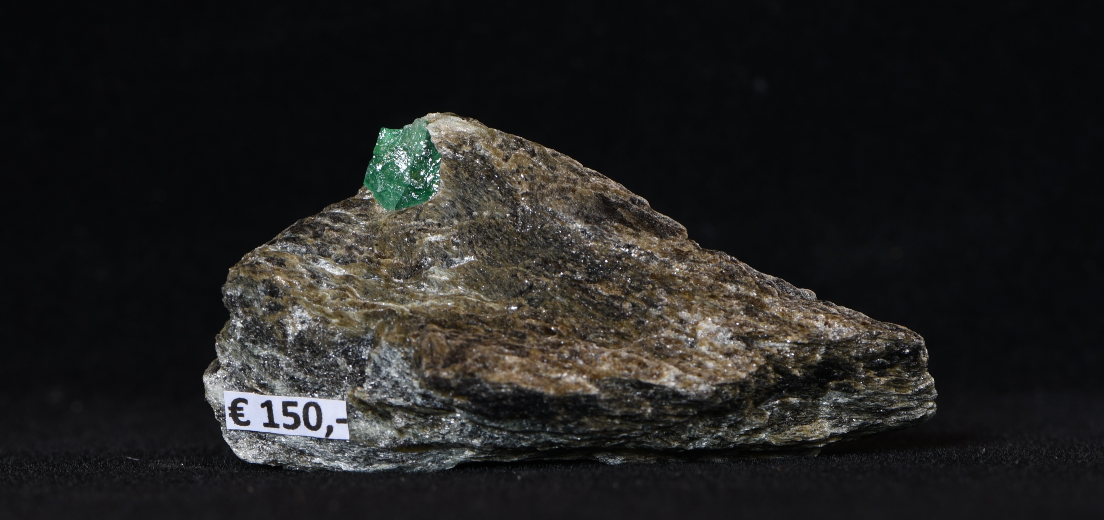 Auf dieser kleinen Stufe sitzt ein wunderschöner, klarer Smaragdquerschnitt mit einer sehr guten Farbe. Der Querschnitt misst 7 mm x 7 mm und ist zwischen 1 mm und 4 mm breit.