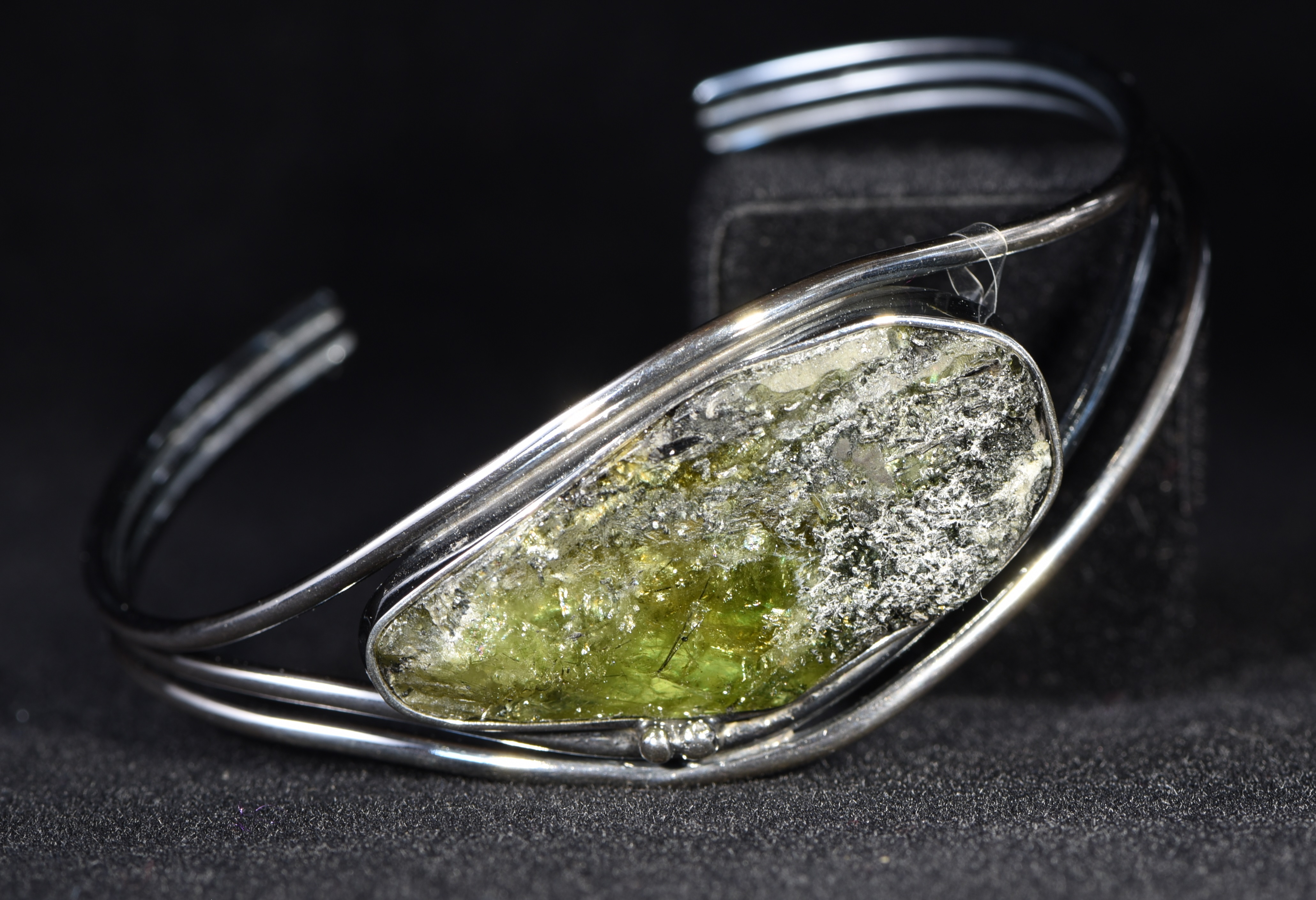 Der Sphen ist an manchen Stellen noch leicht mit Chlorit (Kluftsand) bedeckt und in Silber eingefasst. Das Silber ist teilweise geschwärzt. Der Armreif ist hinten offen und daher größenverstellbar.